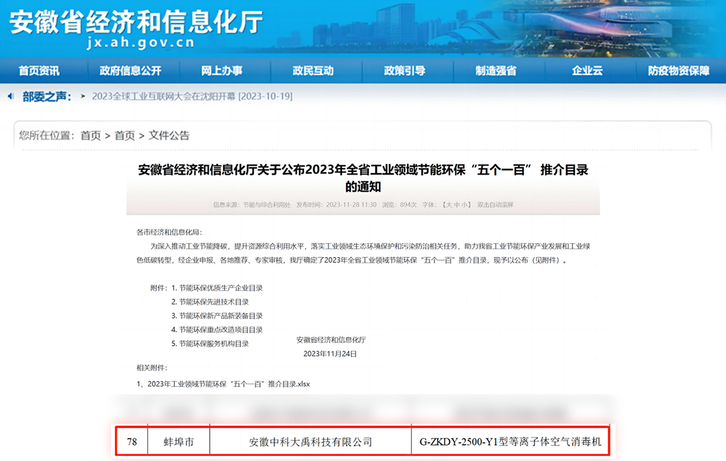 • 入選2023年全省工業領域節能環保“五個一百”推介目錄(節能環保新產品新裝備:G-ZKDY-2500-Y1型等離子體空氣消毒機)